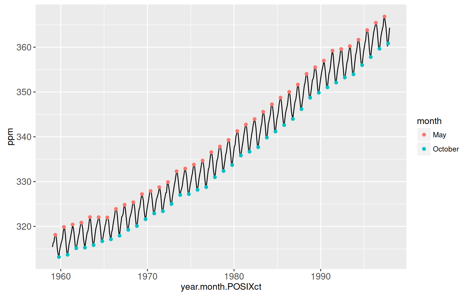 The data visualization also reveals the interesting seasonal trend that attains a local maximum each May and a local minimum each October. This seasonal trend can be explained by considering the forests in the Northern Hemisphere. The leaves on the trees in these forests perform photosynthesis, the chemical conversion of CO2 to oxygen. During the winter months there are no leaves on the trees, so CO2 accumulates in the atmosphere until it peaks in May of each year. When the leaves come back each year, they perform photosynthesis throughout Spring and Summer, which causes the atmospheric CO2 concentration to drop until it reaches its yearly minimum in October.