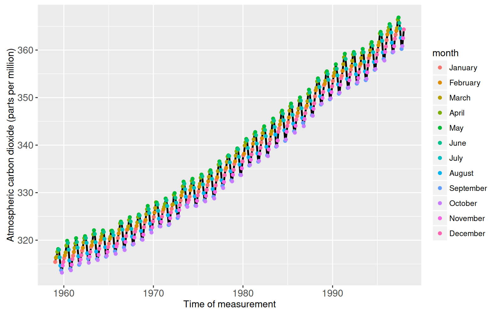 For example, consider the following data on atmospheric carbon dioxide (CO2) concentrations, recorded monthly between 1959 and 1997.